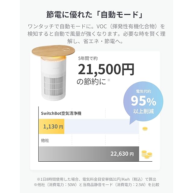 【節電に優れた「自動モード」】ワンタッチで自動モードに。VOC(揮発性有機化合物)を検知すると自動で風量が強くなります。必要な時を賢く理解し、省エネ・節電へ。