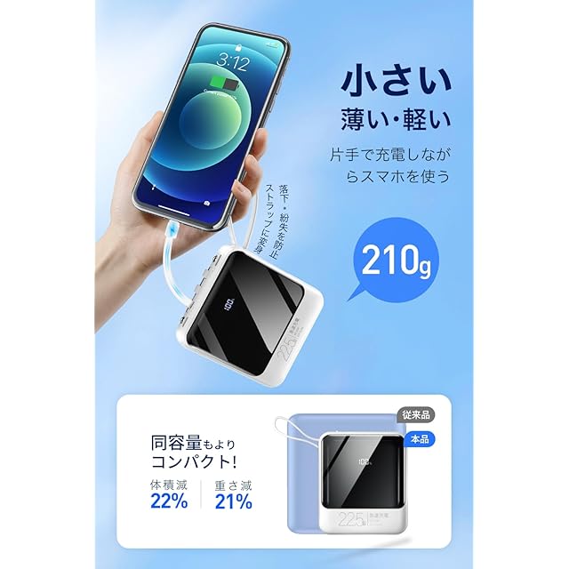 【軽量小型・大容量携帯充電器】ポケットにも収まるほどコンパクトなボディで、22800mAh大容量を備える軽量・小型モバイルバッテリーです。スマホ、タブレットなどのデバイスへ複数回も充電可能で、内蔵ケーブルがストラップのように使え、片手で充電しながらスマホも使用可能で、持ち運びに超便利。出張、旅行、移動中、キャンプなどの時でもバッテリー切れを心配することはなく、台風、地震など緊急災害時に非常用電源としても使えます。