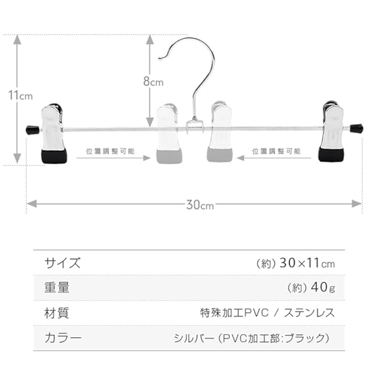 <p><b>PVCクリップで滑り落ちずにしっかりと固定!<br> ズボンやスカート、マフラーなど様々な用途に適したハンガー!</b></p> <p>高い耐久性、位置調整可能が可能な可動式クリップ、シンプルでとても使いやすいズボンハンガー!<br> クリップにPVCコーティング加工で衣類にやさしく、ハンガーからズレ落ちを防ぎます。<br> 大人用から子供用衣類はもちろん、スカートやマフラー、タオル、インナー小物などいろいろなシーンで大活躍!</p> <ul> <li><b>ステンレス製で丈夫で頑丈!</b><br> 本体はステンレス製で耐久性が高く、お洒落なデザイン&軽量で場所を取らずに収納できます。<br> 丈夫で頑丈なので変形もしにくく長く愛用していただけます。</li> <li><b>PVC加工ですべりにくい!</b><br> クリップの先端部分はPVCコーティング加工されているため、滑り落ちずにしっかりと掛けることができます。<br> スカート類もすべりにくく、型崩れを防ぎ、服を傷つけません。</li> <li><b>可動式クリップで位置調整可能!</b><br> クリップは可動式で衣類の幅に合わせて位置を簡単に移動できます。<br> 大人用衣類から子供用まで幅広い衣類に対応し、様々な用途に適したハンガーです。</li> <li><b>両端PVC加工!</b><br> クリップの部分だけでなく、ハンガーの両端にもPVCコーティング加工がされているので、紐付きの衣類を掛けやすくずれ落ちる心配がありません。</li> <li><b>軽量&シンプル設計!</b><br> シンプルで実用的なデザイン、とてもスリムでクローゼット収納力抜群です。<br> 衣類の型崩れを防ぎ、スリッパやインナー小物など様々な物にも適しています。</li> </ul> <p>仕様<br> ●材質:ステンレス、PVC<br> ●重量:(約)40g<br> ●サイズ:(約)30cm×11cm<br> ●カラー:シルバー(PVC加工部/ブラック)<br> ※個体差やロット・モニター環境等により、色味やサイズが若干表記と異なる場合がございます。</p>