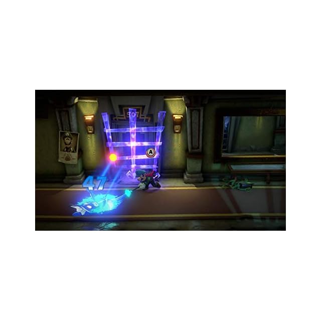 ルイージの新たな相棒「グーイージ」。本作では、ルイージそっくりで緑のジェル状の物質"グー"でできた「グーイージ」を新たな相棒に、ルイージでは進めない鉄格子や危険な罠の上をすり抜けたりと、2人で協力しながら謎や仕掛けに挑みます。おすそわけプレイにも対応し、ストーリー中、2人同時プレイに切り替えることができ、1Pはルイージ、2Pは「グーイージ」を同時に操作しながら、ストーリーを2人で楽しめます。