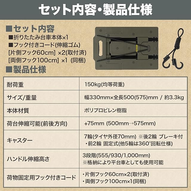 【余裕の耐荷重150kgで幅広く使用可能】宅配物や買い物品などの貨物、家具、クーラーボックス、ポリタンクなどの重い荷物も軽々と運べます。アウトドア、引越し、旅行、ショッピング、イベントなど様々なシーンで大活躍! 【折り畳んでコンパクトに収納】ハンドル部を折り畳めば天板がフラットになり平台車としても使用可能!大型の家具などを運ぶ際に便利です。 使用しない時は部屋の隙間やクローゼット、ベットの下、車のトランクなどに簡単に収納できます。 【わずか3.3kg!軽量設計で楽々持ち運び】 女性の方でも簡単に持ち運べる軽量設計。お出かけの際も必要なときだけ使用することが可能です。イベントや仕事現場の大きな荷物の運搬にもおすすめ! 【荷台が伸縮可能で幅広の荷物も安定して運搬】荷台部分は前方向に長さを延長することができます。6+1の7輪構造を採用しており強度も高く、大型のクーラーボックスや大量の書類など幅の広い荷物を運搬する際もスムーズに移動可能です。 【静かで走破性の高い大型ゴムタイヤキャスター】こだわりのキャスター(車輪)にはボールベアリング内蔵でスムースなことはもちろん、大型のゴムタイヤを採用し、静音性と走破性を両立しており段差の多い屋外でも安心してご使用いただけます。 360°回転する自在キャスターと直進性を確保する固定キャスターを適切に配置し、小回り性と直進安定性も両立させています。 【牽引モードモード・手押しモード切替可能】ハンドル部の角度は90°以上に曲げることが可能で、スイスイ引っ張る「牽引モードモード」、グイグイ押せる「手押しモード」を状況に応じて使い分けることが可能です。 【荷物を固定するバンジーケーブルを付属】伸縮性の高いバンジーケーブルを2本付属させており、不安定な荷物もしっかり台車に固定でき、落下の心配なく安全に運搬が可能です。不安定な荷物の荷崩れのリスクも軽減できます。 安心ポイント1【長期保証】弊社では徹底した品質管理により、すべての商品に弊社保証規定に基づいた製品保証を付帯しております。 安心ポイント2【信頼のPL保険適用事業者】 万一、商品が原因で損害が発生した場合には最大1億円まで補償される損害補償に加入しております。 安心ポイント3【日本企業&高品質なカスタマーサポート】 弊社は東京のものづくり企業です。高品質な商品とサービスをお届けすべく、日本人スタッフが親切丁寧にご対応させていただきます。