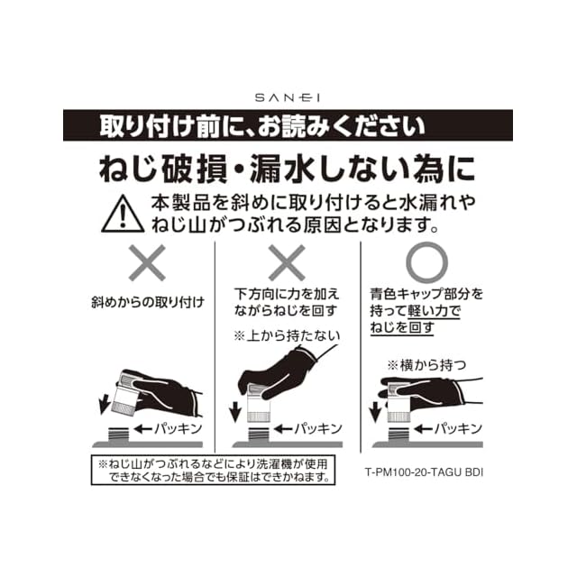 ※他社製ホースの仕様によっては、ホース接続部より水モレする場合があります。またお使いの洗濯機ホースに曲がり癖がついている場合、アダプターに横からの力が加わり、水モレにつながる可能性があります。そういった場合はSANEI製の洗濯機ホースを購入し、交換して下さい。また以下のような取り付け方は水もれやねじ山がつぶれる原因になりますので使用前によくご確認下さい。➀アダプターが洗濯機側に対し斜めに取り付け➁ホース口が斜めに取り付け➂洗濯機の給水口に破損や変形がある *ねじ山がつぶれるなどにより洗濯機が使用できなくなった場合でも保証はできかねます。