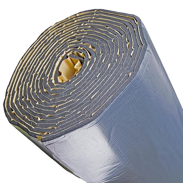 【商品規格】100cmx5m 1枚。厚みは6.5mm以上で、施工時に内装に干渉しない最適な厚みとなります。実耐熱温度は80-90℃となり、炎天下の車内の使用に耐えます。無理のある使用の防止の為ラベル表記上は更に低めに設定中です。アルミ箔と難燃防音ゴムフォームで構成された断熱材です。これ一枚で遮音性能、吸音性能、断熱性能、騒音減衰力、防腐性があります。