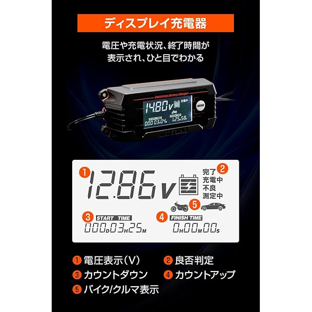 【仕様1】対応バッテリー二輪:2.3~28Ah/四輪:27~80Ah、ベント型/シールド/VRLA/ジェルバッテリー ※リチウムバッテリー使用不可