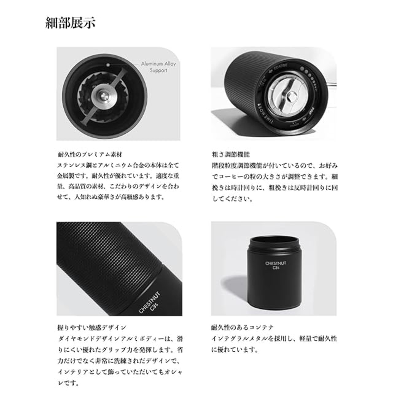 1.ブランド:TIMEMORE 型番:栗子C3S 素材:アルミ金属+ステンレス(全金属) 刃:ステンレス サイズ:本体147x52mm