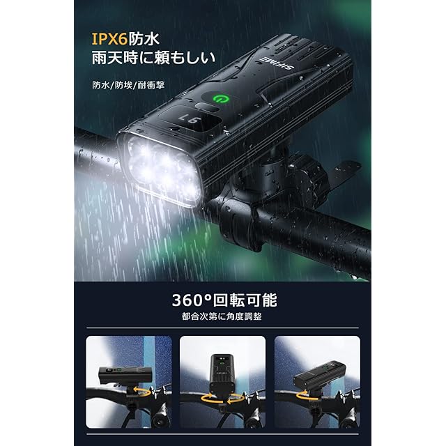 【IPX6防水】工具不要、どんな種類の自転車にも簡単に取付可能、360°回転ブラケットで、照らしたい角度に自由調整可能。アルミ合金製のヘッドライト、衝撃に強く、日常使用に不意な落下や衝撃にも壊れにくい。さらにIPX6防水規格により、雨天時にも頼もしい。