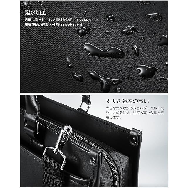 「大容量&収納力抜群」注意:旧バージョンでいただきましたお客様の声をすべて反映して大幅改良しました。(改良点:縫製と検品の改良、丈夫で耐久性もあります。)このビジネスバッグサイズは:縦30cm×横41cm×幅10cm、重さ:1025g。使い勝手がありサイズです。バッグの外側と内側に多くの収納ポケットがあり、書類、会社紹介資料、ペットボトル、折り畳み傘、15.6インチまでのノートパソコン、A4ファイルなどがすべて収納できます。傘専用の収納ポケットがあり、傘やペットボトルを安全に収納できるため、資料やパソコンが濡れる心配もいりません。背面ポケットはファスナー付きなので、貴重品を入れても安心感があります。