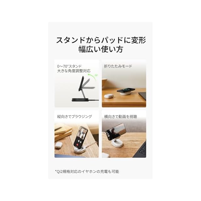 【スタンド/パッドに変形】パッドモードでは乗せるだけで簡単に充電。ビデオ通話中や動画視聴時にはスタンドモードに変形させ、デスクやベッドサイドなど、どんな場所でもご利用いただけます
