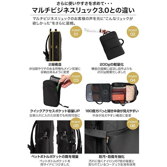 【機能説明】こんな機能が欲しかったをさらに凝縮。35リットルの大容量/3箇所の防犯機能/2層構造に改良し弁当箱楽々収納/2WAYモデル/撥水加工/YKKファスナー/前作よりも200g軽量化成功/ペットボトルポケット×2/チェストベルト/15.6インチPC対応/拡張機能/多収納/スーツケースのように使用可能/出張時にスーツケース不要/背面セキュリティーポケット付き/クイックアクセスポーチ付属/USB通気口/スーツケース固定バンド/等・挙げ出したらきりがなくなってしまうくらい多機能バックを低コストで完成させました。