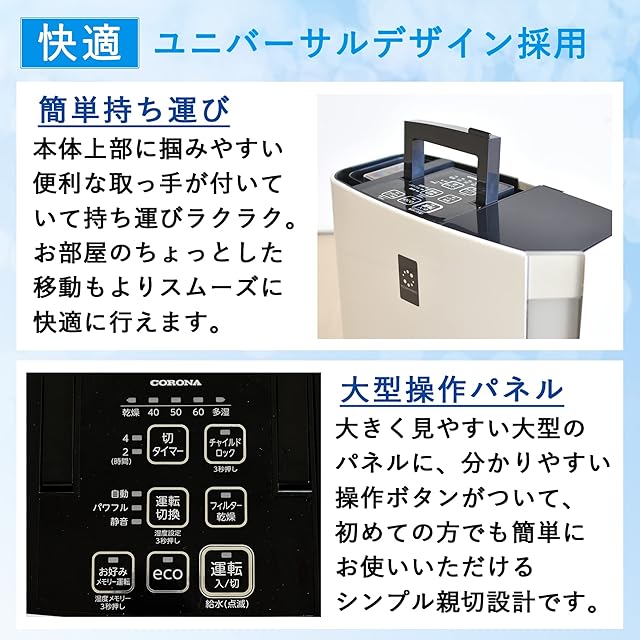 【ユニバーサルデザイン採用】大きく見やすい大型パネルに、わかりやすい操作ボタンがついて、どなたでも使いやすい設計です。また、本体上部には掴みやすい取っ手がついていて、持ち運びも気軽に簡単に行えます。