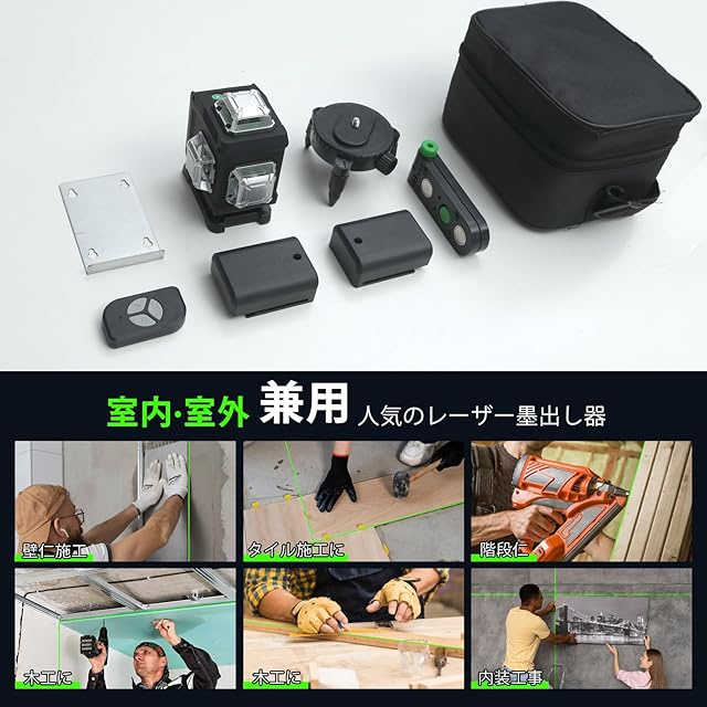 レーザー墨出し器、墨出しレーザー、4Dグリーンレーザー墨出し器、4x360°、水平器 レーザー ビルドとアライメント用、充電式バッテリー、リモコン、磁気回転スタンド レーザー安全基準:クラス2 16ライン