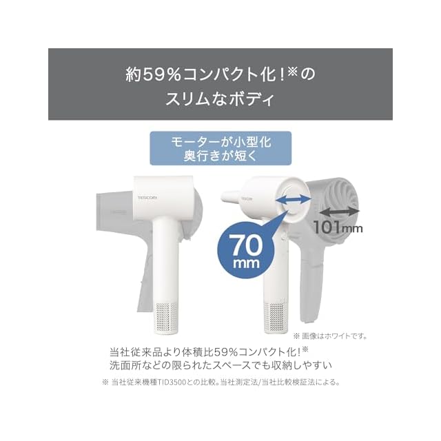 <b>【 仕様 】</b><br>■品名:マイナスイオン ヘアドライヤー<br>■電源:AC100V 50/60Hz<br>■消費電力:1200W<br>■カラー:ベージュ<br>■主材料:本体:PC/ABS<br>■コードの長さ:1.7m<br>■付属品:セットフード<br>■スイッチ:切替スイッチ TURBO/SET/OFF、MODEスイッチ HIGH/LOW/COOL/AUTO<br>■風量(m3/分):0.8m3/分(JIS規格) / 4.1m3/分(自社基準)<br>■温風温度:100℃(周囲温度30℃の場合。TURBO-HIGH使用時)<br>■本体寸法:高さ約239mm×幅約92mm×奥行き約70mm(本体のみ)、高さ約239mm×幅約146mm×奥行き約70mm(フード付き)<br>■本体質量:約450g(本体のみ 電源コード含む)、約495g(フード付き)<br>■化粧箱寸法:高さ285mm×幅125mm×奥行き75mm<br>■化粧箱質量:590g<br>■外装箱寸法:高さ310mm×幅320mm×奥行き395mm<br>■外装箱質量:7.9kg<br>■梱包数:12台<br>■生産国:中国<br>■パーツ:セットフード(TA033000)<br>■保証期間:1年間<br><br><b>【 説明 】</b><br>■速い・軽い・静か、毎日のヘアドライのストレスを解放する、新しいドライヤーのかたち。<br>■大風圧の高速ブラシレスDCモーター搭載。最新モーターが巻き起こす体感4.1m3/分(自社測定)のパワフルな風が髪をかき分け、根元から一気に乾かします。<br>■高速ブラシレスDCモーターは、モーターに摩耗するパーツがないので長寿命1,000時間を実現。長く安心して使えます。 ※モーター単体での仕様<br>■ノズルを短くし無駄を省いたI字型のボディで、本体を約320gまで軽量化。モーターをグリップに内蔵したことで重心バランスに優れた形状を実現。ドライヤーを振る際の手首の負荷を軽減します。 ※電源コードを除いた本体質量<br>■約59%コンパクト化!スリムなボディだから洗面所などの限られたスペースでも収納に便利です。<br>■※当社従来機種TID3500との体積比較。当社測定法/当社比較検証法による<br>■低騒音化で多様なライフスタイルにフィット。自社従来製品より約7%低騒音化。動作音が控えめなので家族が寝ている夜間や小さいお子様がいる家庭でも使いやすいです。<br>■※当社従来機種TID3500との比較。当社測定法/当社比較検証法による<br>■選べる4つのモード搭載。AUTOモードが熱ダメージを抑制し、髪を優しく乾かす。HIGH/LOW/COOL/AUTOの4つのモードから好みの温度を選べます。温度に合わせて温度LEDリングの色が変化します。<br>■インテリアに馴染むやわらかいデザイン。落ち着いたカラーとマット素材を採用。サークル×I字型のボディデザインが家電っぽさを抑え、インテリアと調和します。<br>■マイナスイオンが髪の広がりの一因となる静電気を低減。髪のツヤもアップします。<br>■ブローしやすいセットフード付属。口が平らになっているからブラシにフィット。<br>■ラク抜きプラグで取り外し簡単。レバーを押すだけでコンセントから簡単に抜くことができます。<br>■お掃除しやすいインレットネット。着脱が簡単でお掃除がラクだから、いつでもきれいを保てます。<br>■電源コードがスッキリまとまるクイックコードバンド付き。<br>■※製品の定格・仕様は改良のため、予告なく変更することがありますのでご了承ください。<br><br><b>【商品に関するお問い合わせ】</b><br>テスコムホームページよりご確認ください