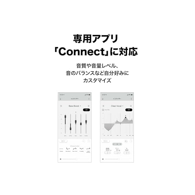専用アプリ「Connect」に対応。音質や音量レベル、バランスなど自分好みにカスタマイズ。あなたのイコライザー設定を、ほかのユーザーにシェアすることができます。また、ほかのユーザーが SNS に公開したイコライザー設定をアプリから取り込みも可能です。