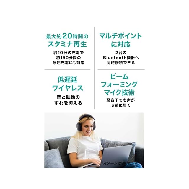 その他、便利な機能 ●最大約20時間の連続再生、約10分の充電で約150分間の急速充電に対応 ●電池残量を気にせず使える有線接続対応 ●音と映像のずれを抑える低遅延ワイヤレス ●騒音下でも声が明瞭に届くビームフォーミングマイク技術 ●オープンエアー構造のため閉塞感がなくヘッドホンを着けたまま自然なオンライン通話が可能。 ●2台のBluetooth機器へ同時接続できるマルチポイントに対応 ●シンプルボタンで直感的な操作が可能 ●プラスチック包装材を使用しない環境に配慮したパッケージ。