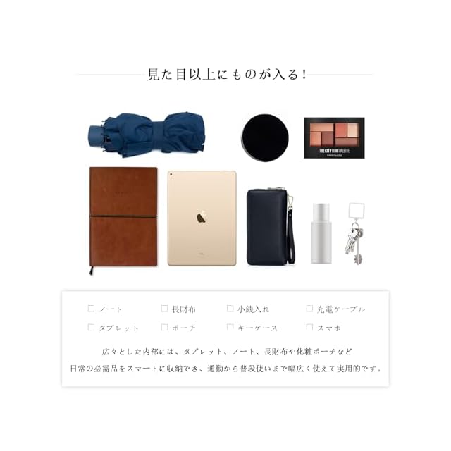 ちょうどいいサイズ:上長さ28cm × 下長さ26cm × 幅9cm × 高さ23cmで、わずか500gの軽さ。デイリーに欠かせないティッシュ、財布、携帯、メイク用品など、すっきり収めることができる理想のサイズです。どこへでも軽やかに、エレガントなスタイルをお楽しみください。