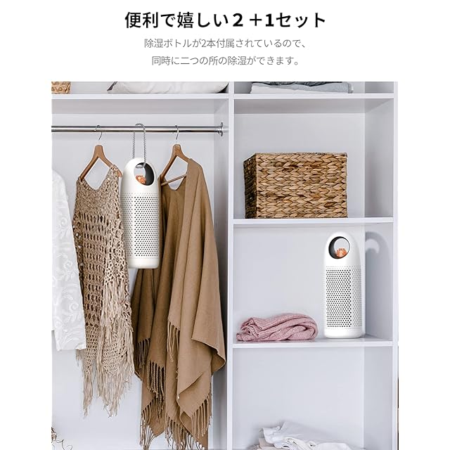 【同時に二つの所で除湿可能】除湿ボトルが2本付属されているので、同時に二つの所の除湿ができます。1本の除湿ボトルは除湿量最大100mlで、対応面積の目安は約3畳。クローゼットなどの少し広めのスペースもピッタリ。