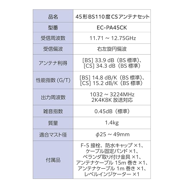 DXアンテナ bsアンテナ BS・110度CSアンテナセット 45形 【アンテナ本体+レベルインジケーター+ベランダ用取付金具+同軸ケーブル+設置用スパナ】 2K 4K 8K(3224MHz)対応 マニュアル付き EC-PA45CK | primer