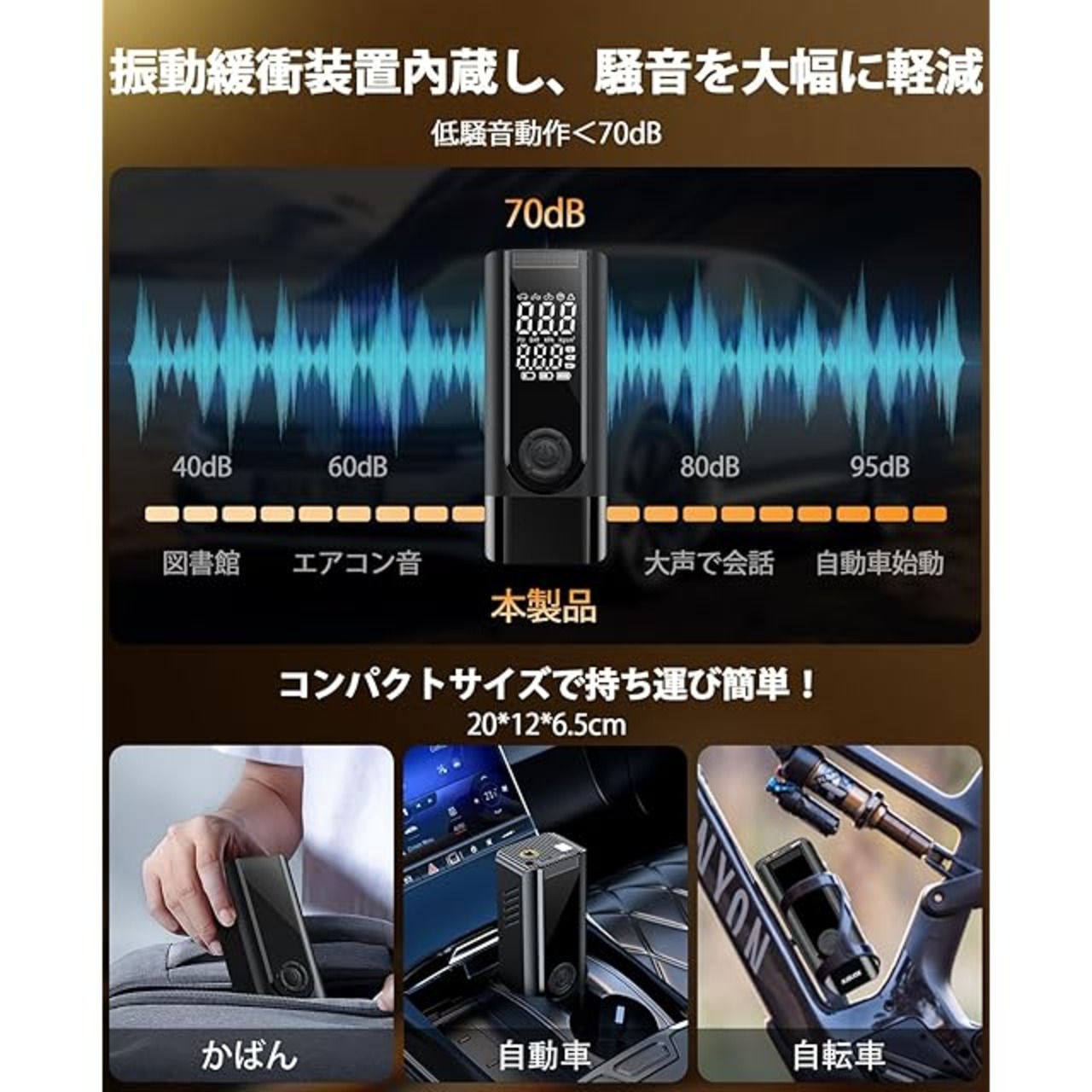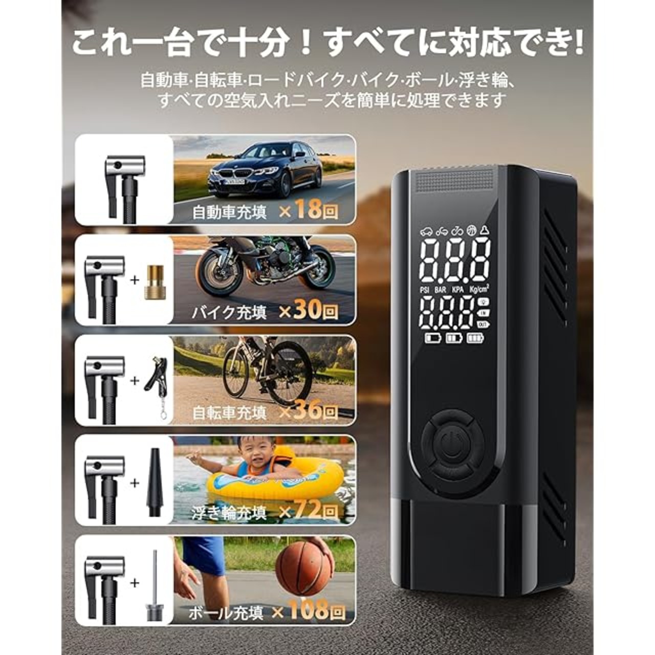【大容量バッテリー・英式米式全てに対応】他社の電動空気入れより、英式バルブと安全ハンマーを増加しました。電動空気入れをCE/ FCC/PSE認証済み,、過熱防止、漏電保護など各種保護機能を備え、ご長時間安心してお使いいただけます。Zgzuxo空気入れ 電動は大容量のリチウムイオン バッテリーを搭載したこのポンプは、1 回の充電で4 台の車のタイヤを膨らませることができます。大のバッテリー量を採用し、使用時間が2倍に増加した。一度充電して長時間動作可能です。自宅のガレージからアウトドアまで、場所を選ばず使用できます。