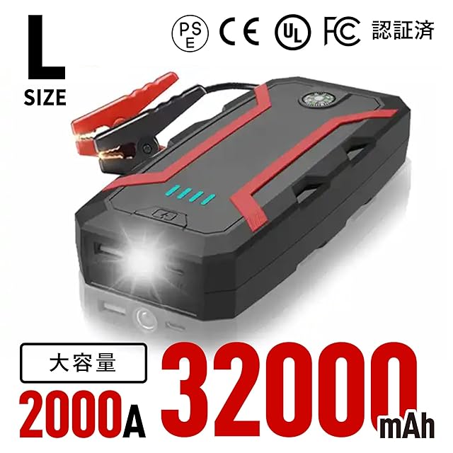 【ジャンプスターターとは】バッテリーが弱くなってエンジンが掛からない「バッテリー上がり」を再起動させるのがジャンプスターター。 強力な32000mAhの容量と2000Aのピーク電流で、6.0L以下のガソリン車や4.0L以下のディーゼル車を問題なく始動可能です。 ロードサービスで最も利用者が多い車のトラブルの「バッテリー上がり」対策に車に積んでおくと心強いアイテムです。
