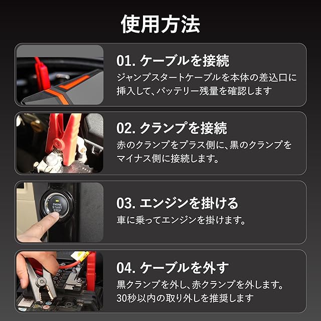 【使いやすい操作】ジャンプスターターの操作は非常に簡単。バッテリーのプラス(+)とマイナス(-)にクランプを挟むだけで、車のセルを起動できます。初心者でも安心して使用できます。