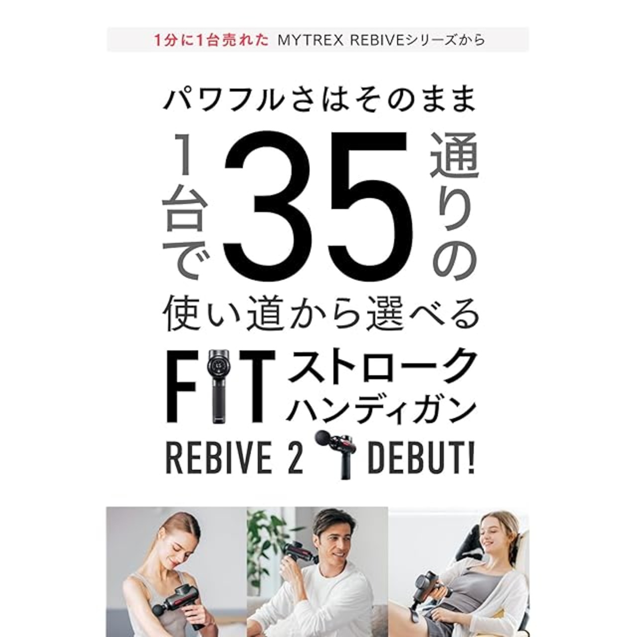 1分に1台売れたMYTREX REBIVE シリーズからパワフルさはそのまま<br> 1台で35通りの使い道から選べるストロークハンディガン REBIVE2 DEBUT!<br> <br> MYTREX REBIVE 2<br> マイトレックス リバイブー 2<br> <br> <br> POINT.1 浅い筋肉から深い筋肉まで全身に的確にアプローチ<br> POINT.2 押し当てなくても深層筋までしっかり届く!<br> POINT.3 使用感を追及した止まらない耐圧性能<br> POINT.4 5段階の速さ(振動)レベル自分好みに調整可能<br> POINT.5 5種類のアタッチメント身体にFITする心地よさ<br> POINT.6 誰でも使いやすいこだわりのデザイン設計<br> <br> ●ブランド名: MYTREX(マイトレックス)<br> ●販売名: MYTREX REBIVE2<br> ●商品名: MYTREX REBIVE2- マイトレックス リバイブ2 -<br> ●品番: MT-RB2-24G<br> ●本体寸法: 約154mm×60mm×189mm(本体のみ)<br> ●重量: 約729g(本体のみ)<br> ●素材: 本体:PC+ABS、ポリカーボネート、シリコン、アルミ合金、アタッチメント:ABS樹脂、EVA樹脂、シリコン<br> ●パッケージ内容: 本体×1・充電用USBコード×本・ACアダプター×1・アタッチメント×5・取扱説明書×1・収納ケース×1・アタッチメント用ストッパーゴム(予備)×2<br> <br>