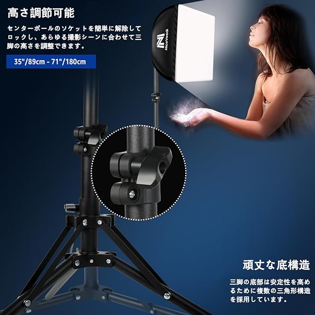 【高品質で耐久性のある三脚】各ソフトボックスには高品質三脚スタンドが搭載されており、逆折りたたみデザインを採用しているため、三脚を使用する際にスペースを節約できます。3セクションの伸縮可能な長さにより、三脚は38cmチまで折り畳むことができ、最大で160cmまで延長することができます。持ち運びが容易で、さまざまな作業状況に合わせて調整できます。太いチューブの直径は、撮影中の照明ソフトボックスに優れた安全性、信頼性、十分な安定性を提供します。