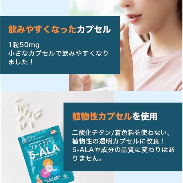 ✅ネオファーマジャパン正規代理店フェアリーフォレストから【ファイブアラ】が登場! ✅皆様のお声をもとに改善いたしました!! (現在、ネオファーマジャパン社名変更)✅【ネオファーマジャパンの原材料5-ALAを100%使用しております】 (現在、社名変更) 安心・安全のGMP認定工場で製造!✅【植物性の無着色透明カプセル・飲みやすい小さいカプセルに】二酸化チタン、着色料不使用 お客様の声『着色料が気になる。飲みやすいサイズにして欲しい。』など、お客様のお声をもとに植物性の無着色の透明カプセルにこだわり改良致しました。✅【持ち運びやすいパッケージ】 紫外線からの保護、防湿性、携帯性に優れたアルミパッケージを採用!いつでもどこへでも、手軽に持ち運び可能です!✅【安心安全の国内GMP認定工場にて製造!】GMP認定工場とは原料の受け入れから最終製品の出荷に至るまでの全行程において、【適正な製造管理と品質管理】を承認された工場のことです。