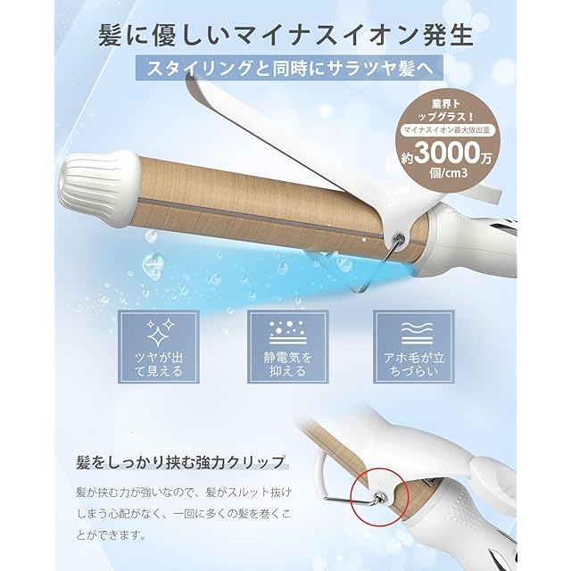 【水蒸気爆発を抑えるシルクプロコテ・3000万マイナスイオン】髪内部にある水分をできる限り逃がさずにスタイリングできるテフロン加工のパイプを搭載、髪が痛む原因の水蒸気爆発を抑えて、熱によるダメージから大切な髪を守ります。その上、高密度マイナスイオン発生器搭載、髪へのダメージを軽減することで髪のうるおいを保って理想のスタイリングを叶えるカールアイロンです。