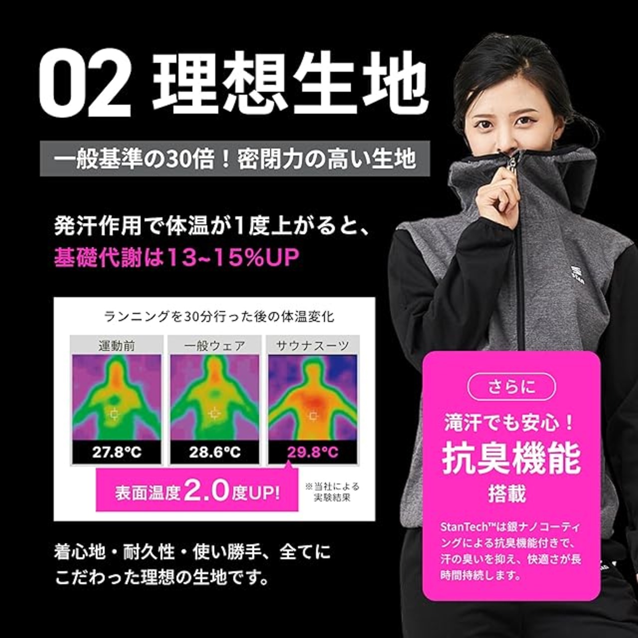 【 今一番売れているサウナスーツ 】フィットネスの専門家であるパーソナルトレーナーが10,000時間以上の指導経験を元に考案した発汗力抜群のおしゃれで高品質なstʌnサウナスーツ。 【 特殊素材による強力な発汗力 】薄い発泡ポリウレタン製素材をウェアの内側に接着加工した生地によってあなたの発汗をしっかりと促します。運動中の発汗を促すことで身体に溜まった余計な水分や内臓機関を通じて老廃物を排出することができ、基礎代謝を高める効果が期待できます。また、日常でも基礎代謝が上がるため、汗をかきにくい人、減量したい人、運動でストレスの発散したい人、気持ちのいい汗をかきたい人にもオススメです。素材も銀ナノコーティングにより抗臭機能も備えた生地なので、汗の嫌な臭いをおさえ快適にお使い頂けます。 【 実験で明らかになった減量効果 】スポーツ生理学基づいた実験の結果、一般的なウェアを着用して運動した時に比べて、サウナスーツを着用して運動をした時の方がカロリー消費量がアップし、体重や体脂肪の減少に効果的なことが実証されました。当社による実験でも 通常のウェアに比べて、体重の減少量が約3倍以上(=水分量の減少)体温の表面温度が約2倍以上アップしていることが確認できました。そのため、ダイエットやシェイプアップに適したダイエットウェアと言えます。 【運動に最適な超軽量ストレッチ素材】このサウナスーツはストレッチの効いた超軽量素材のため、とても軽くて動きやすく運動に最適です。また、スポーツウェアによく用いられるポリエステルを主な素材に採用しているため、高い吸水性と速乾性を実現しました。運動中は汗を素早く吸収し、洗濯後はすぐに乾きます。そのため毎日の運動にも安心してご使用いただけます。その他にも防水、防風加工もされているので寒い時期や急な天候悪化にも対応可能です。ウォーキングやランニング、筋トレやヨガなどのエクササイズ時はもちろん、ちょっとした防寒着としてもお使い頂けます。【洗濯機での洗濯脱水OK】素材の性質上、手洗いでのお洗濯、脱水せず濡れたまま平干し乾燥を推奨しておりますが、洗濯機でのお洗濯や脱水も可能です。お手入れが簡単になる分どんどんご使用いただけます。(注:洗濯機での洗濯脱水は手洗い自然乾燥より若干機能性が落ちやすくなる可能性がございます。予めご了承くださいませ。)本ページは「フルジップ 」タイプの商品ページになります。他のタイプをお求めの方は[stanサウナスーツ]もしくは[下にある比較表]で検索ください。
