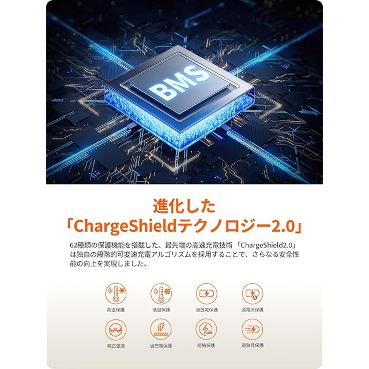 【進化したChargeShield2.0】62種類の保護機能を搭載した、先端の高速充電技術 「ChargeShieldテクノロジー2.0」 は、独自の段階的可変速充電アルゴリズムを採用することで、さらなる安 全性能の向上を実現しました。