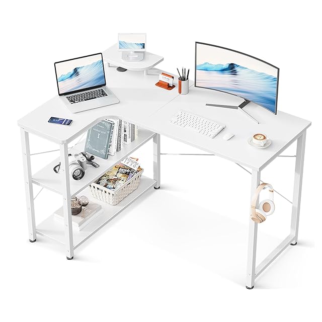 【ラック付きデスク】デスクの足元には一体型のラックが備え、本や書類などを使いたい時にサッと取り出せます。また、L字型のデザインで部屋のコーナーを最大限に活用でき、ご家庭でもオフィスでも、日常の操作に十分なスペースを確保できます。
