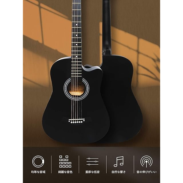 「仕上げとデザイン」アコースティックギターは職人の手で仕上げられ、初心者向けに調整された構造。上質な木材を使い、湿気処理と真空乾燥を施した高品質ギター。