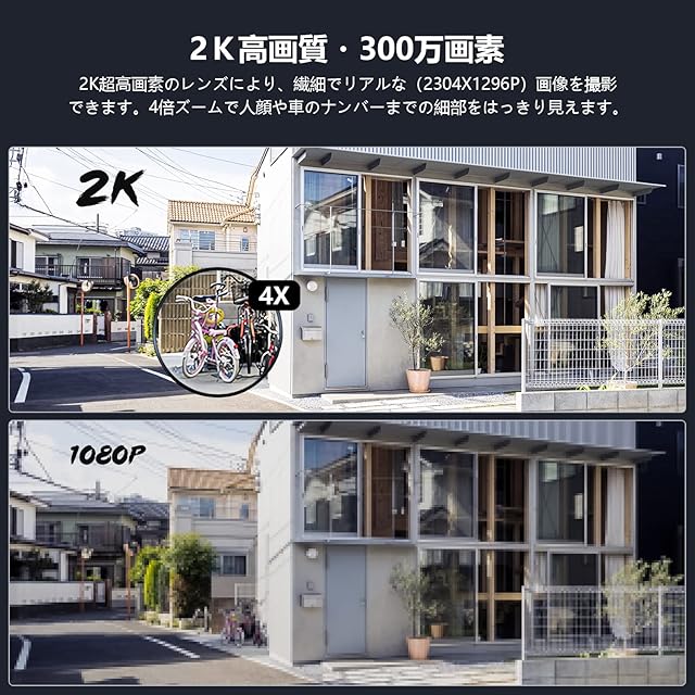 【2K超高画素・360°全方位PTZ回転】防犯カメラは1/2.9"CMOSセンサーと2K超高画素のレンズにより、従来の1080P製品と比べて、より繊細でリアルな(2304X1296P)画像を撮影できます。更に4倍デジタルズームを搭載され、遠隔から細かい部分まで撮影でき、画面を拡大してもぼやけなく、人顔や車のナンバーまでの細部をはっきり見えます。水平(パン)350°/垂直110°(チルト)回転機能が搭載され、360度全方位を監視られます。いつでもどこでもスマホで視点を移動したい位置をスライドして、レンズの向きを好きな角度に調整できます。住宅や玄関、庭、車の防犯に最適です。