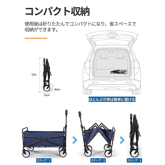 持ち運びに便利なデザイン:キャリーワゴンは、組み立て不要で、すぐに使用できる便利なアイテムです。軽く引っ張るだけで簡単に折りたためるため、持ち運びにも便利です。買い物や旅行にぴったりで、荷物を楽に運ぶことができ、時間と労力を節約できます。使い方もシンプルで、荷物を積み込んで移動するだけで、日常生活がより快適になります