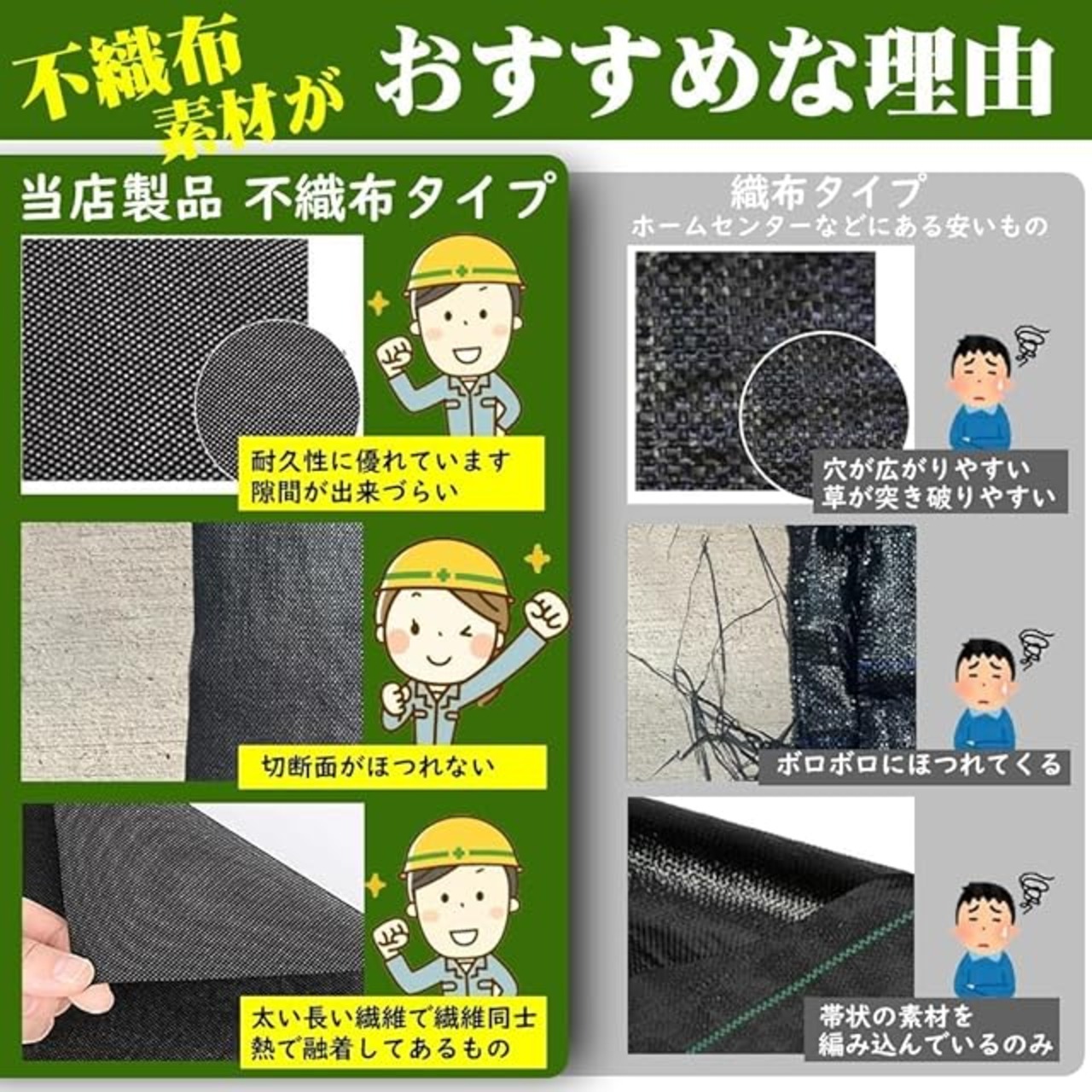【耐久あり】高面密度100g/m²の高品質ポリプロピレン(UV耐候剤配合)を使用し、従来の除草シートに比べて厚みがあり、破れにくいです。雑草や雑草問題を除去する必要がなく、約10年の寿命があります