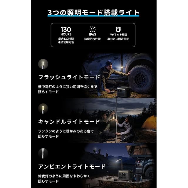 Anker初の充電式ライト付きモデル:ポータブル電源に収納可能な充電式ライトを二つ搭載。収納すれば自動的に充電されるため、充電忘れの心配もなく、いざという時もすぐにご利用可能です。 付属のポールでスタンドライトとしてもお使いいただけます。