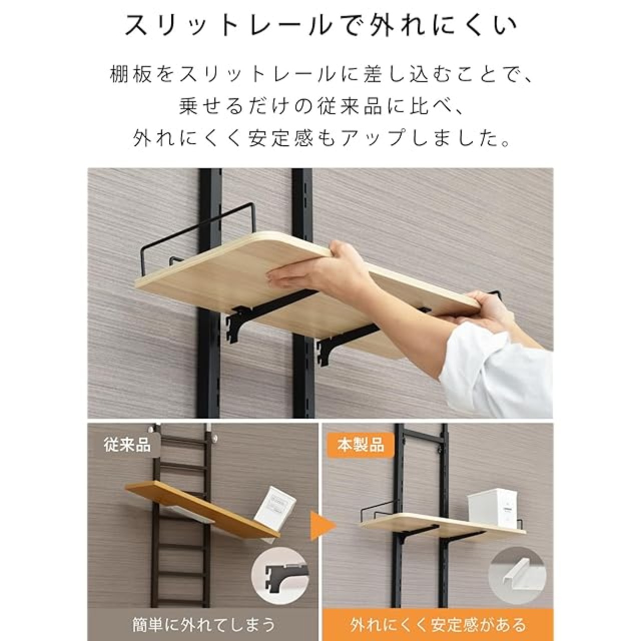 \魅せる、整える、使いやすい/<br> ekans「棚付きランドリーラック 突っ張りタイプ LSH-T200」<br> <br> 【無駄を省いたミニマルフレーム】<br> ●スリットレール採用で圧迫感を消したスッキリデザインに<br> ●フレームに直接差し込むので、外れにくく安定感もアップ<br> ●伸縮しても同じ色(一般的なラックは伸ばすと違う色のパイプが出てくる)<br> <br> 【高さが変えられる可動棚】<br> ●棚の高さは9段階で調節可能<br> ●物が落ちにくいワイヤー付き<br> ●水に強いPVC加工<br> <br> 【簡単設置】<br> ●ハンドルを回すだけの簡単設置<br> ●天井との接着面にはキズ防止の圧着シート付き<br> ●防水パンの枠に設置できるアタッチメント付き(幅約2cm)<br> <br> 【材質】<br> スチール(エポキシ樹脂粉体塗装)<br> ABS樹脂<br> ポリプロピレン樹脂<br> パーティクルボード(メラミン樹脂+PVCシート)<br> シリコン<br> <br> 【サイズ】<br> (約)幅60x奥行29.5x高さ210-270cm<br> <br> 【耐荷重】<br> 棚1段あたり:約6kg<br> <br> 【セット内容】<br> ランドリーラック本体×1<br> 棚板×2<br>