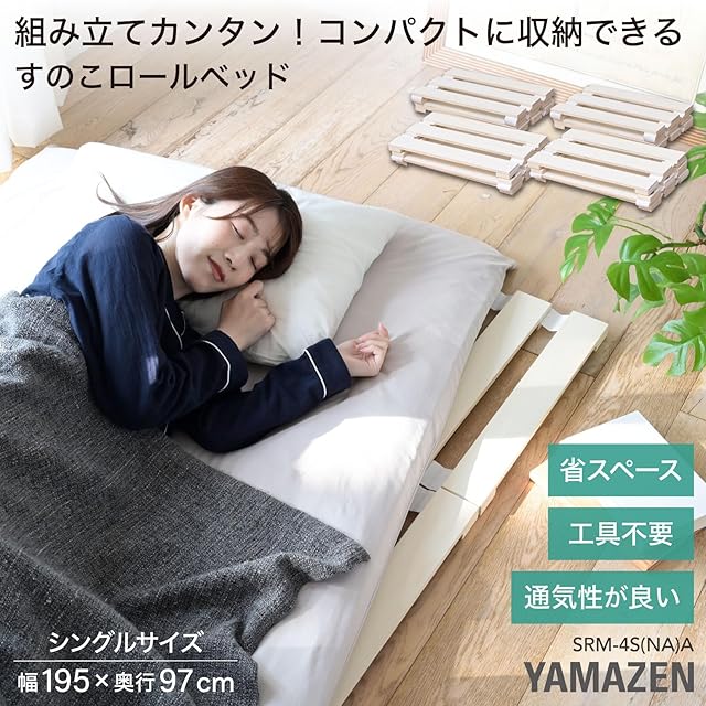 山善(YAMAZEN) すのこベッド シングル コンパクト すのこ ロール式 折りたたみ 通気性 幅195×奥行97×高さ2.7cm ベッドフレーム 一人暮らし 組立てカンタン ナチュラル SRM4-S(NA)A | primer