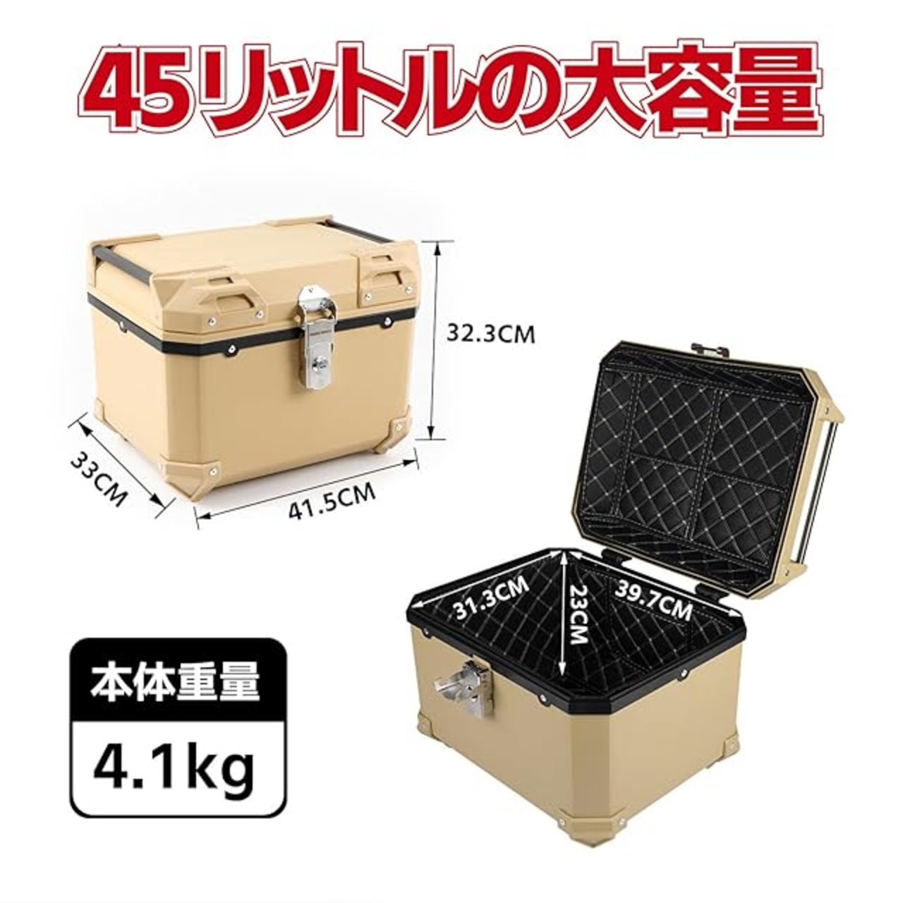 <p>【製品特徴】</p><p>素材: 高品質ABS樹脂製(軽量で耐久性抜群)</p><p>容量: 45L大容量設計でヘルメットやツーリンググッズを収納可能</p><p>防水性能: IP68防塵防水等級(雨やホコリから荷物を保護)</p><p>取り付け: 汎用設計でさまざまなバイクに簡単取り付け</p><p>内装: 厚いPUレザーを使用し、荷物の衝撃を軽減</p><p>【使用シーン】</p><p>配達やメッセンジャー業務</p><p>ツーリング時の荷物保管</p><p>日常使いのヘルメット収納</p><p>急な天候変化時の荷物保護</p>