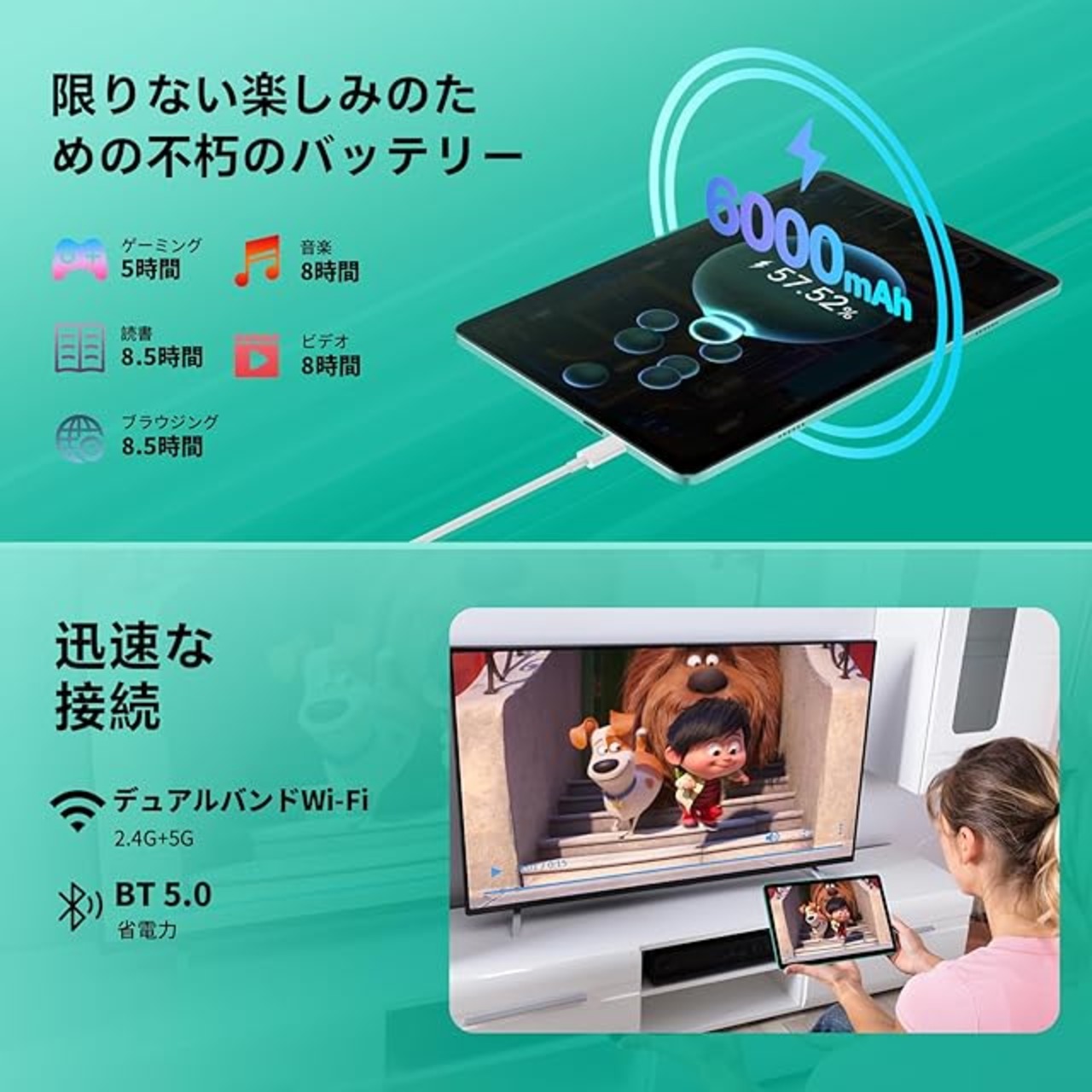 【没入型ディスプレイと長時間バッテリーでエンタメ快適】 10.1インチIPS画面(16:10黄金比)で高精細表示。6000mAhバッテリーは最大9時間の動画再生を実現(Type-C充電対応)。3.5mmイヤホンジャック付きで充電中も音楽視聴可能。シーン例: 通勤中やカフェでの長時間動画視聴にストレスフリー。