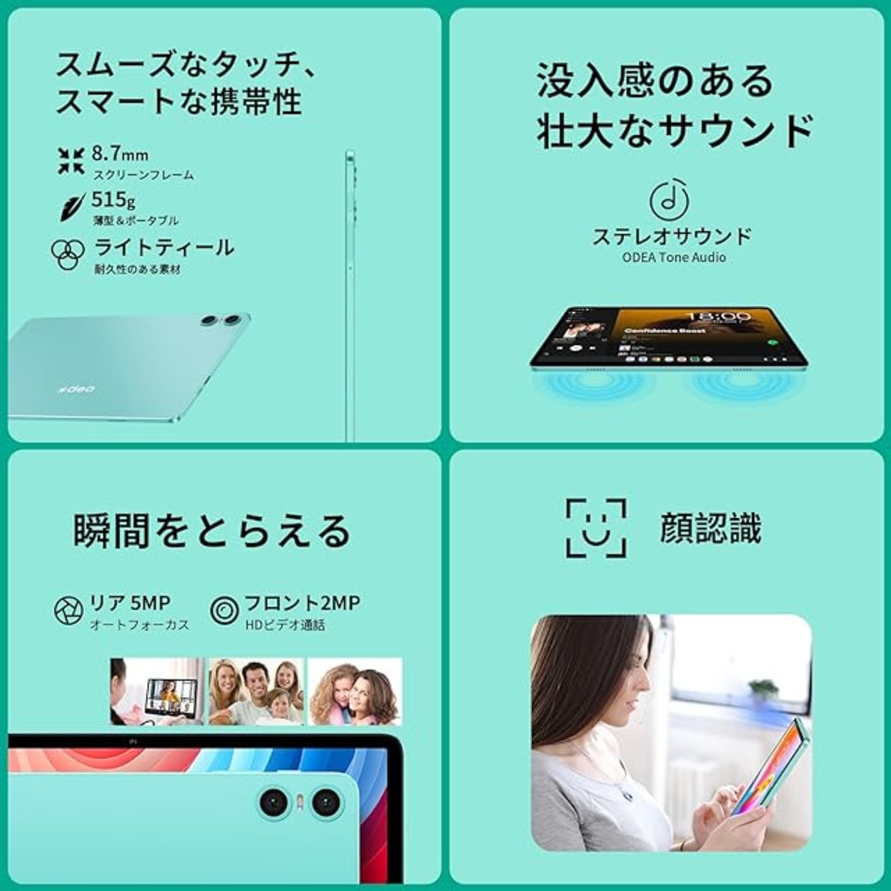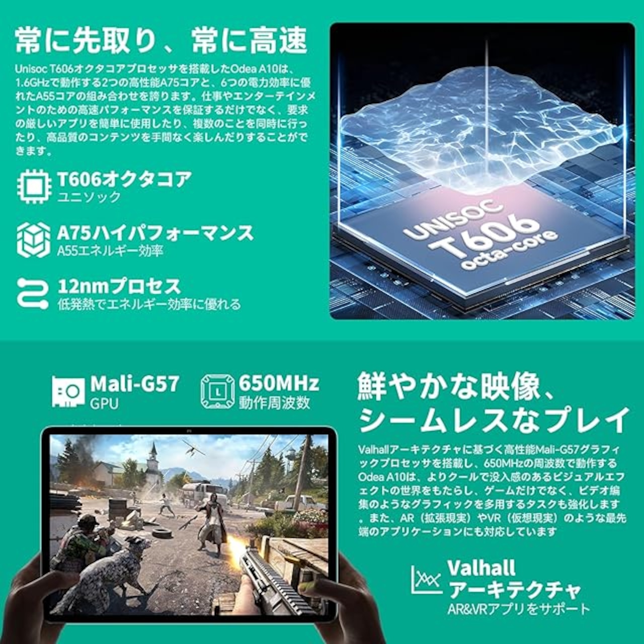 【2025年 Android 15 タブレット 10インチ ODEA A10: 12GB+128GB+1TB拡張、8コアCPU、Widevine L1 Netflix 対応、IPS画面 & 6000mAh長持ち、軽量515g 金属ボディ、日本語説明書付属