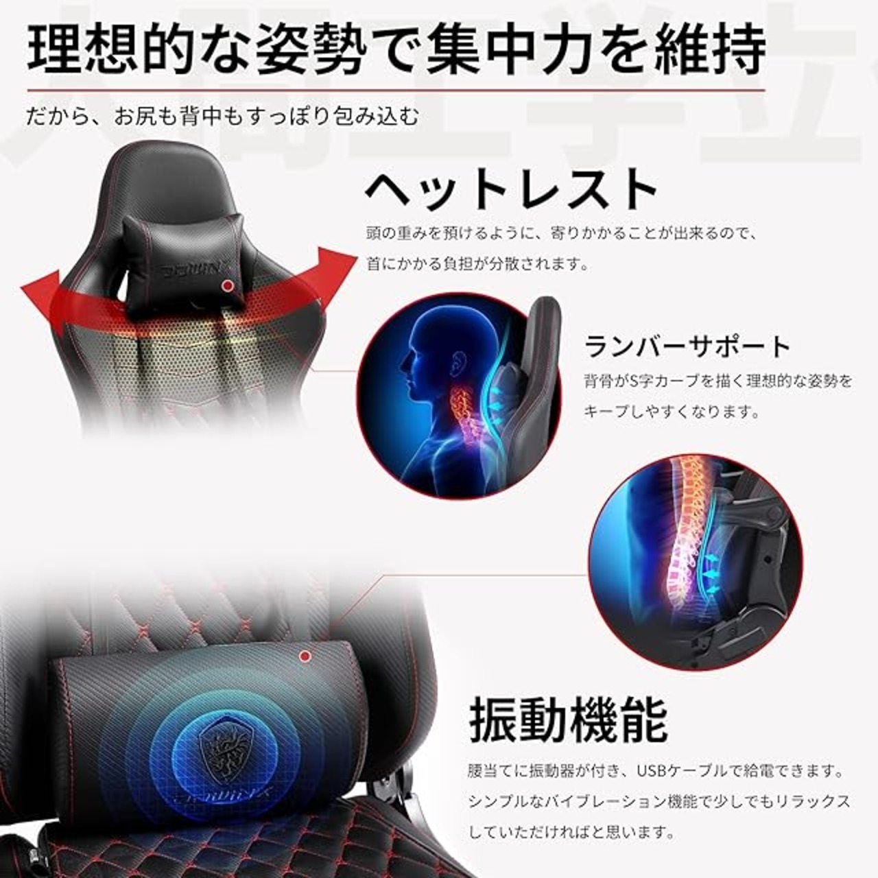 Dowinxについて Dowinxはアメリカトップ10の生産者であり、2工場では約1000のオフラインストア、インターネットカフェ、eスポーツイベントをサポートしています。 仕様: 人間工学ゲーミングチェア 製品型番:LS-6679 フレーム素材:合金鋼 クッション材:軟質ポリウレタンフォーム 表面素材:PUレザー 商品重量:17.7キログラム 生産地:中国 -子どもが誤って食べないよう、小さな部品は手の届かないところに保管してください。 -品質には万全を期しておりますが、万が一、不良品やご不明点がございましたら、お気軽にご連絡ください。24時間以内ご対応させて頂きます。