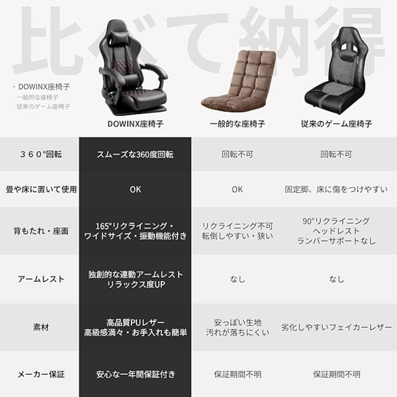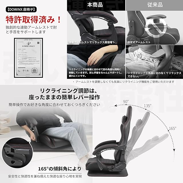 Dowinx ゲーミング座椅子 ゲーミングチェア 座椅子 腰が疲れない 回転座椅子 おしゃれ ゲーム座椅子 ゲーミング パソコンチェア 連動アームレスト ランバーサポート 165°リクライニング チェア ハイバック ブラック LS-667901A