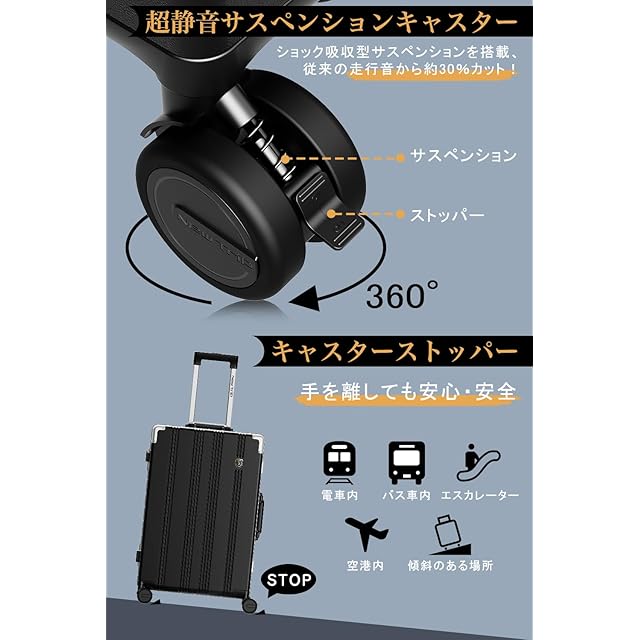 【超静音キャスター&ストッパー付き】360度回転可能のダブルキャスターにショック吸収サスペンションを搭載し、段差のあるところを走行する際の衝撃を吸収しより高い静音性を発揮します。従来の走行音から約30%カット!早朝と深夜でもストレスなくスムーズな走行が可能に。また、キャスターにストッパーが付いているため、電車内などスーツケースが自走してしまう環境でもストッパーをかけておくだけでスーツケースが動き回るのを防ぎます。