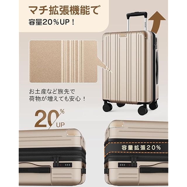 [MONOMI] スーツケース キャリーケース 機内持ち込み 拡張機能付き 大型 軽量 キャリーバッグ S/M/Lサイズ 耐衝撃 静音 360度回転 ダブルキャスター 物掛けフック付き ファスナータイプ TSAロック 海外 旅行 ビジネス 出張 (シャンペンゴールド、Sサイズ/機内持込/1~3泊) | primer