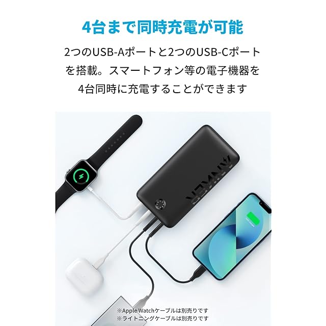 4台まで同時充電が可能:2つのUSB-Aポートと2つのUSB-Cポートを搭載。スマートフォンやワイヤレスイヤホン、タブレット端末などを4台同時に充電することができます。