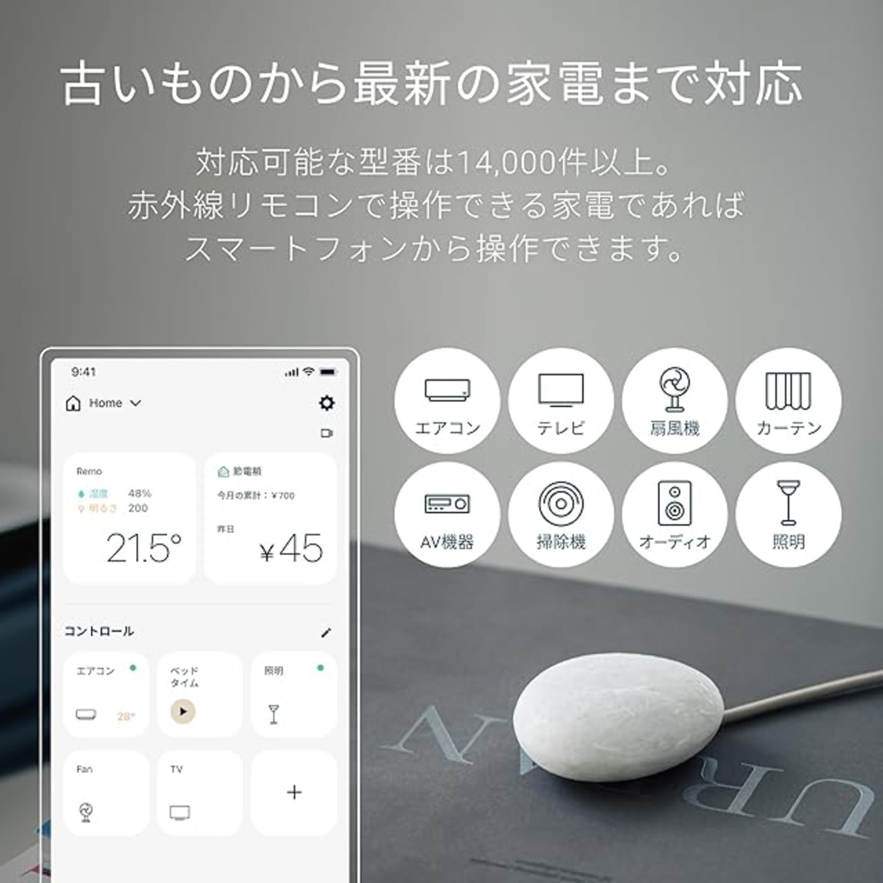 【空気をととのえるスマートリモコン】エアコンの節電機能を備えた次世代のスマートリモコン。家電の遠隔操作やアレクサなどのスマートスピーカーにももちろん対応。