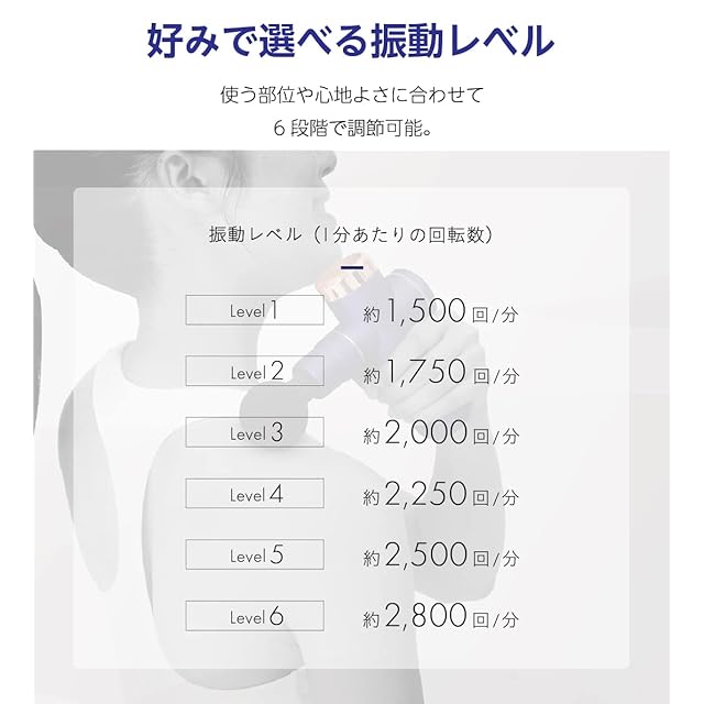 【6段階強度調節】使う部位やお好みに合わせて6段階での強度調節が可能です。LEVEL1(約1500回/分)~LEVEL6(約2800回/分)と細かく調節できるので、自分に合った刺激がきっと見つかります。