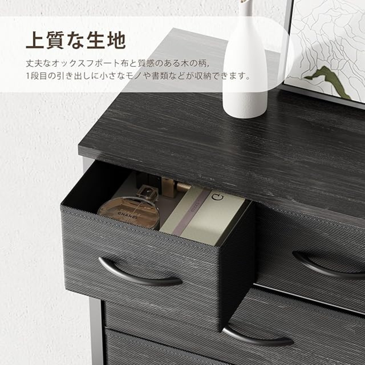 【すごい収納力】チェスト1段目の小さな引き出しには、すぐに使える小物が入っていて、取り出しやすいようになっています。タンスの下二階の引き出しがより高くて、収納できる物がより多様化になります。アクセサリ、ファイル、おもちゃ、お菓子などから、バスタオル、冬着など大いものまで、たっぷり収納できます。天板に鍵、コップ、花瓶、写真などが放置できます。