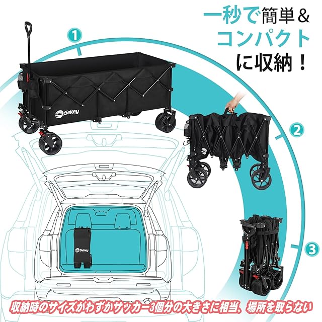 Sekey キャリーワゴン 特大容量300L 高耐荷重200kg 【荷室の長さ113cm】長物対応 【幅10cmのブレーキ付き極太ノーパンクタイヤ】【ベアリング内蔵】 深型 【収納サイズが類似品で最小級】 ワンタッチ収束型 自立収納 アウトドアワゴン キャンプ・釣り・運動会 キャンプカート 黒